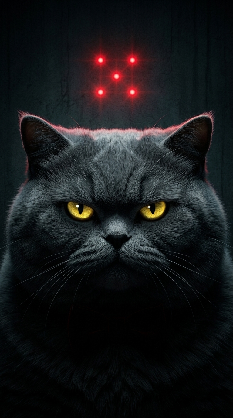 Static tense shot of the cat's face. Red laser dots snap onto the wall one by one in sync with a dramatic sound effect.