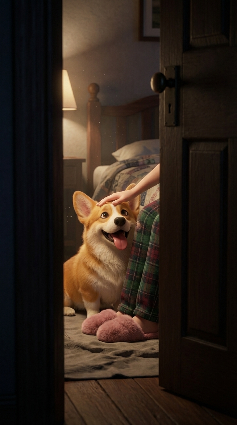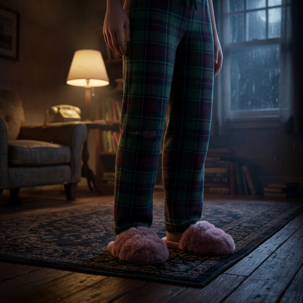 Strong rule: style --- 3D Pixar, cinematic lighting, neo-noir crime mo... ---. A human figure seen only from the waist down, wearing cozy...