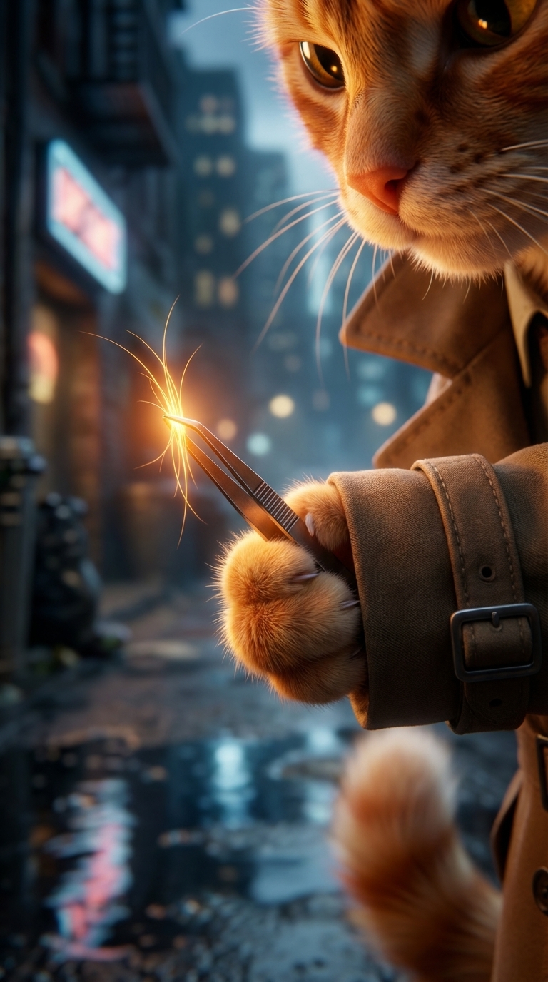 Strong rule: style --- 3D Pixar, cinematic lighting, neo-noir crime mo... ---. Close up of the ginger cat's paw holding a single, glowing...