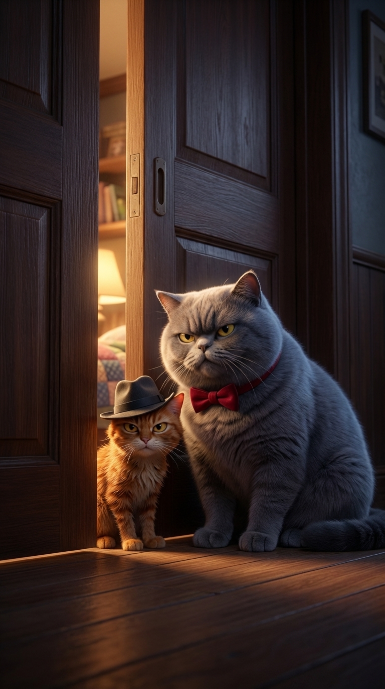 Strong rule: style --- 3D Pixar, cinematic lighting, neo-noir crime mo... ---. The two cats peeking through a crack in the door into a wa...