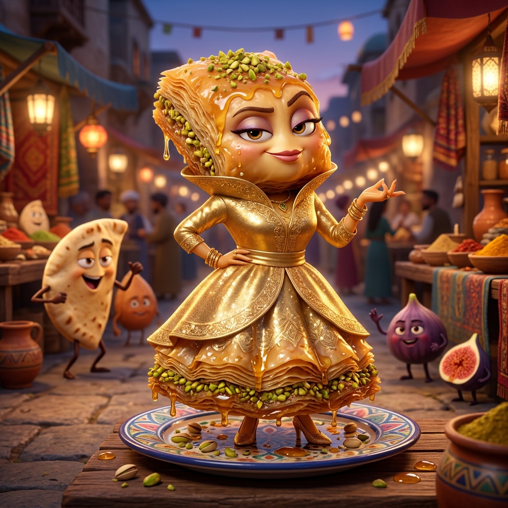 Strong rule: style --- 3D Pixar ---. A glamorous, anthropomorphic piece of rich, layered baklava dripping with honey and pistachios, wear...