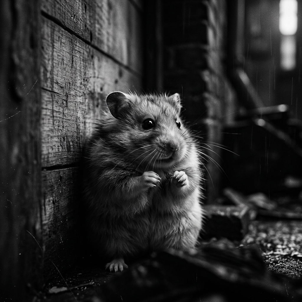 Strong rule: style --- Cinematic Film Noir, realistic animals with exp... ---. A small, fluffy, and very nervous Syrian hamster. He is tr...