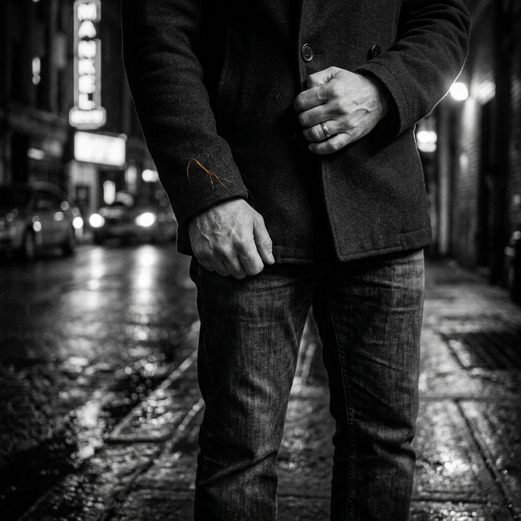 Strong rule: style --- Cinematic Film Noir, realistic animals with exp... ---. A human male, but we only see his hands, lower torso, or l...