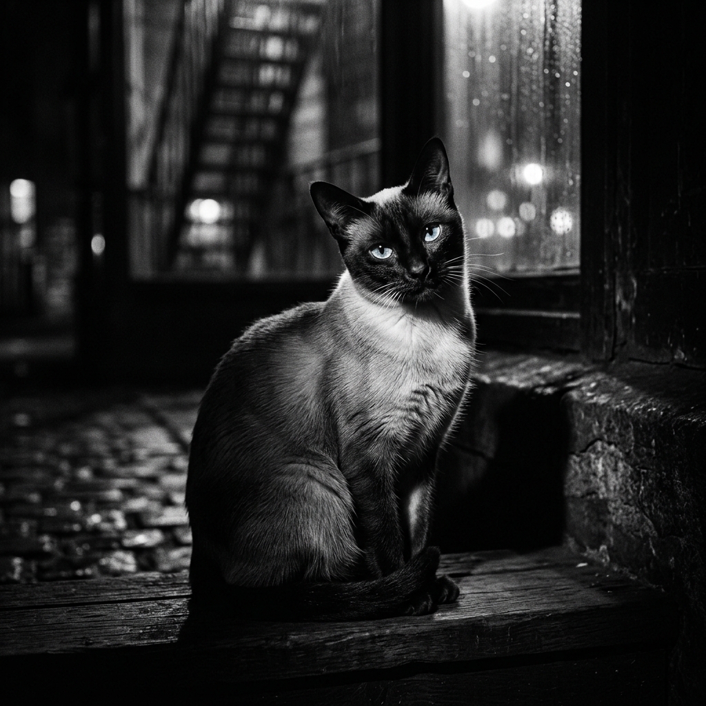 Strong rule: style --- Cinematic Film Noir, realistic animals with exp... ---. A sleek, elegant Siamese cat with striking blue eyes. She ...