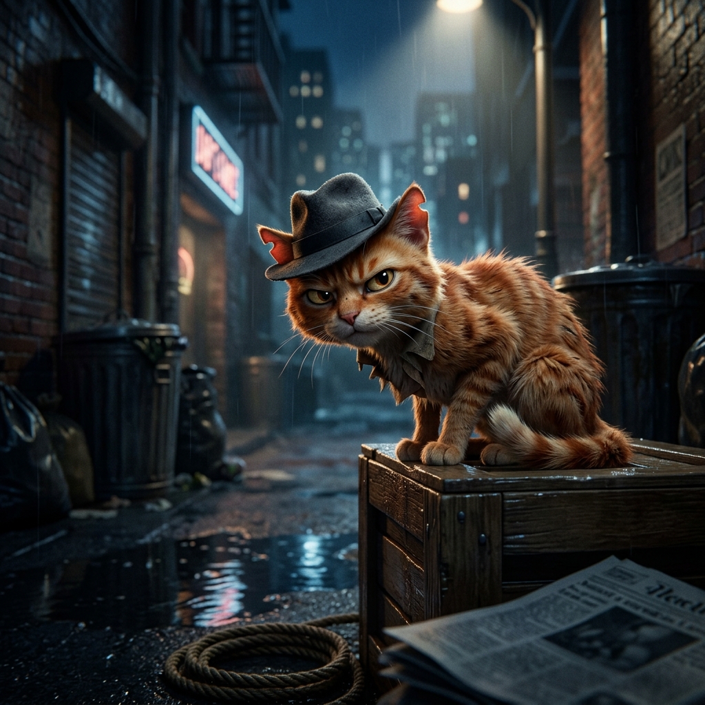 Strong rule: style --- 3D Pixar, cinematic lighting, neo-noir crime mo... ---. A scruffy, skinny ginger street cat with a small nick in h...