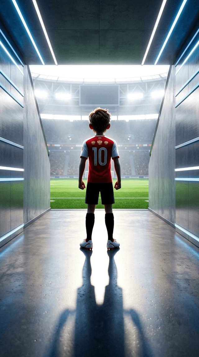 Art style: 3D Pixar-style Animation. Артём стоит в туннеле, ведущем на поле гигантского современного стадиона. Он виден со спины, его фи...