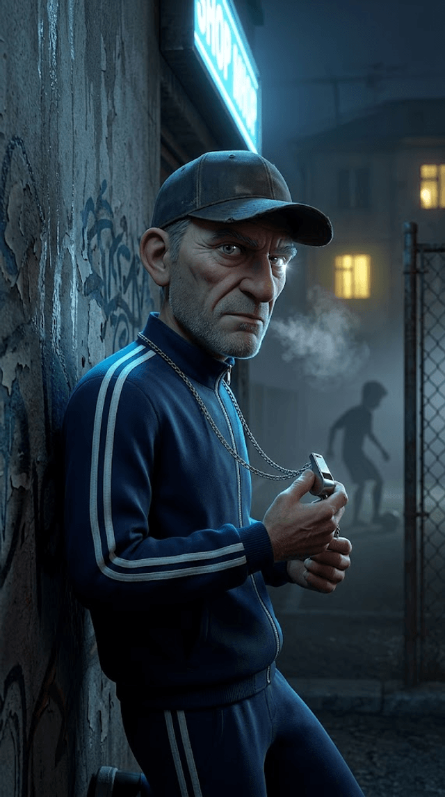 Art style: 3D Pixar-style Animation. Темный угол спортивной площадки, скрытый в густой тени старого дуба. Тренер Савельич стоит, прислон...