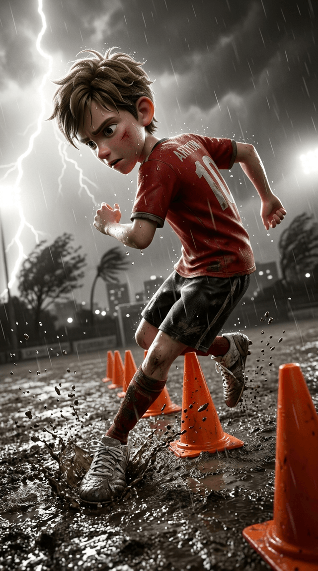 Art style: 3D Pixar-style Animation. Динамичная сцена тренировки под проливным дождем на грязном поле. Артём в рывке преодолевает ряд яр...