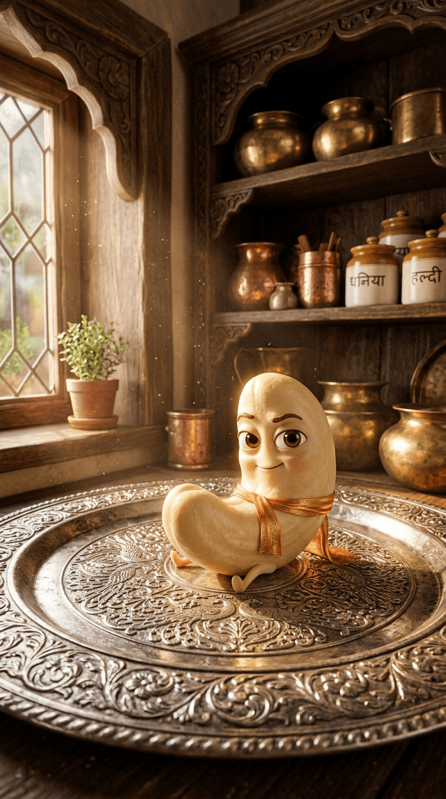 Art style: 3D Pixar. एक पुरानी और आलीशान रसोई का कोना, जहाँ नक्काशीदार लकड़ी के ऊंचे अलमारियों पर पीतल के पुराने बर्तन रखे हैं। खिड़की स...