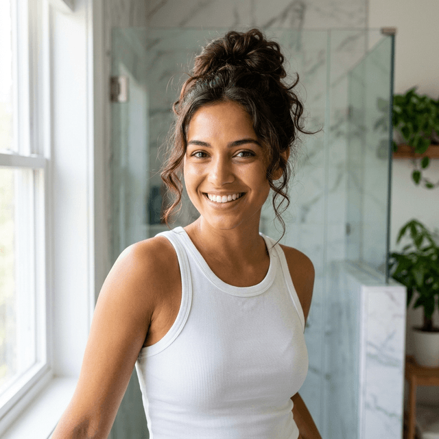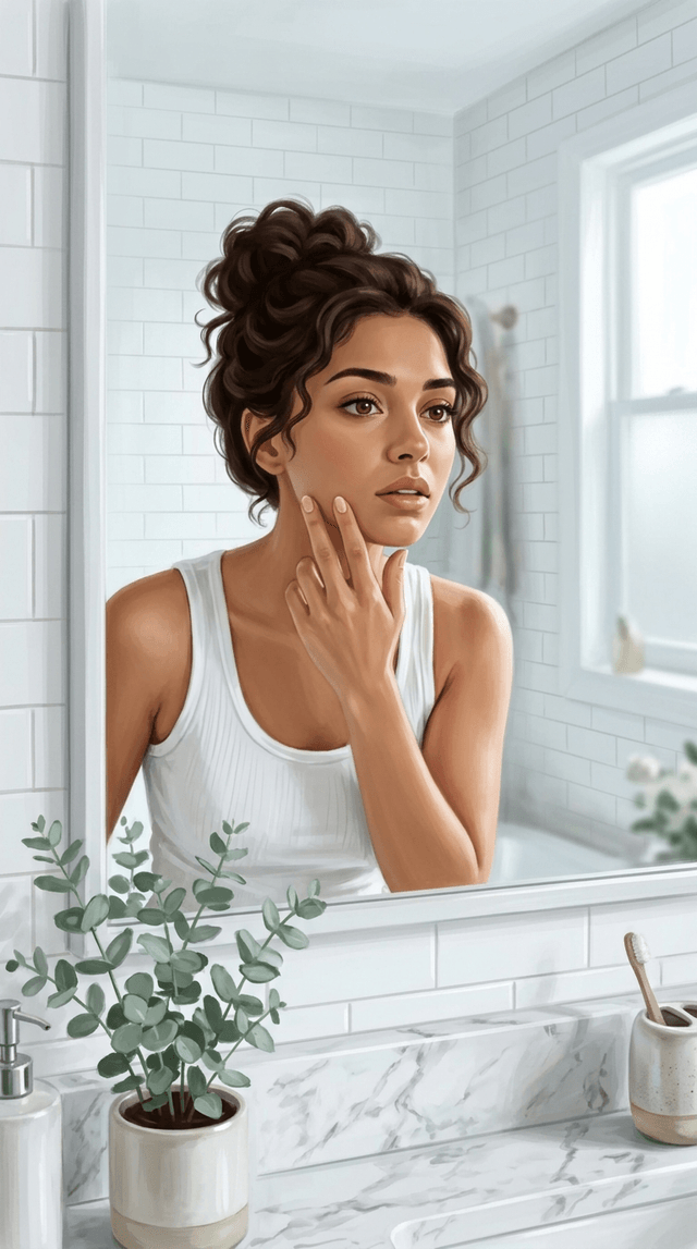 Art style: Original. A close-up shot of a young woman in a bright, modern bathroom looking into a large mirror. The walls are white subw...