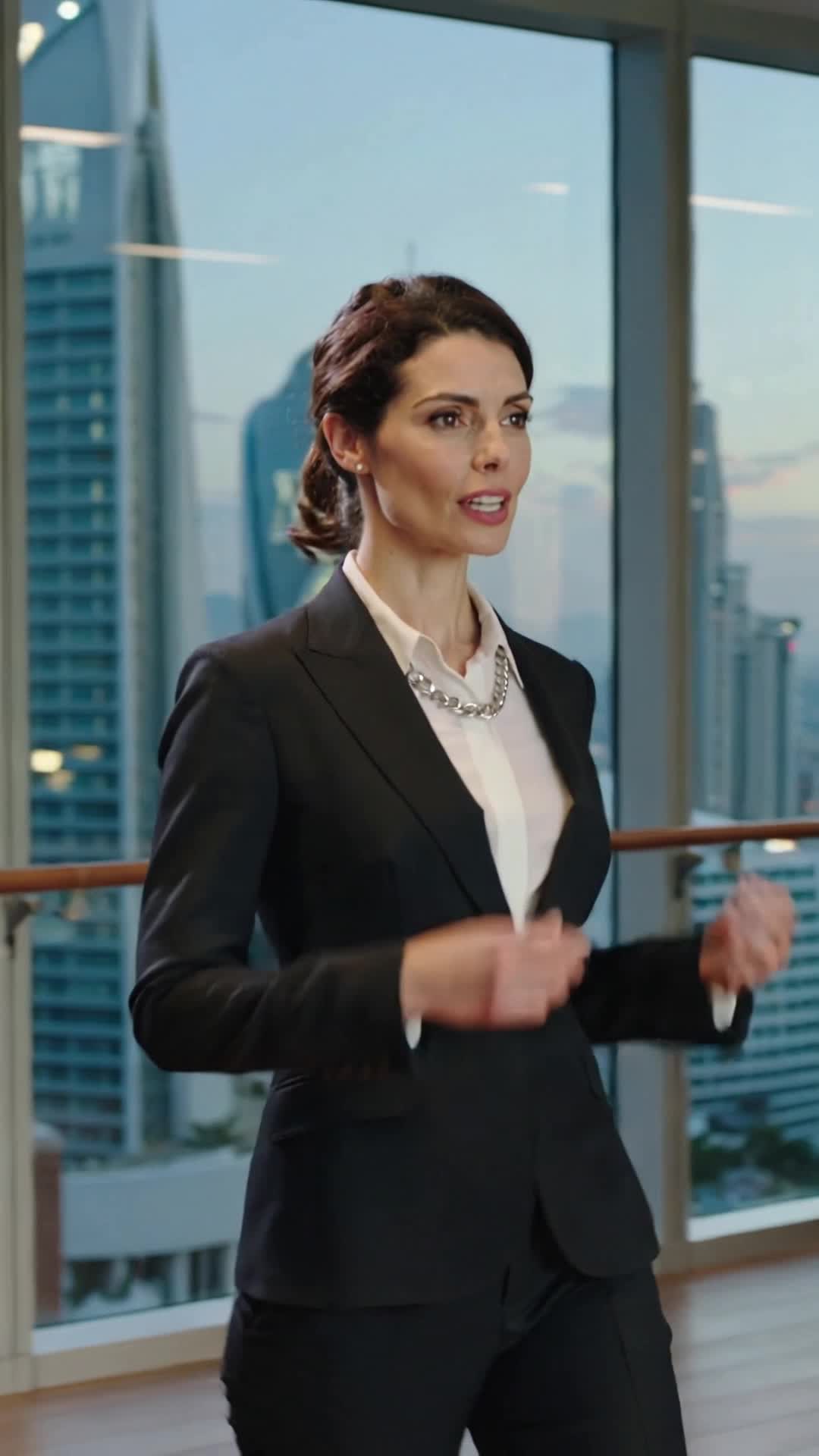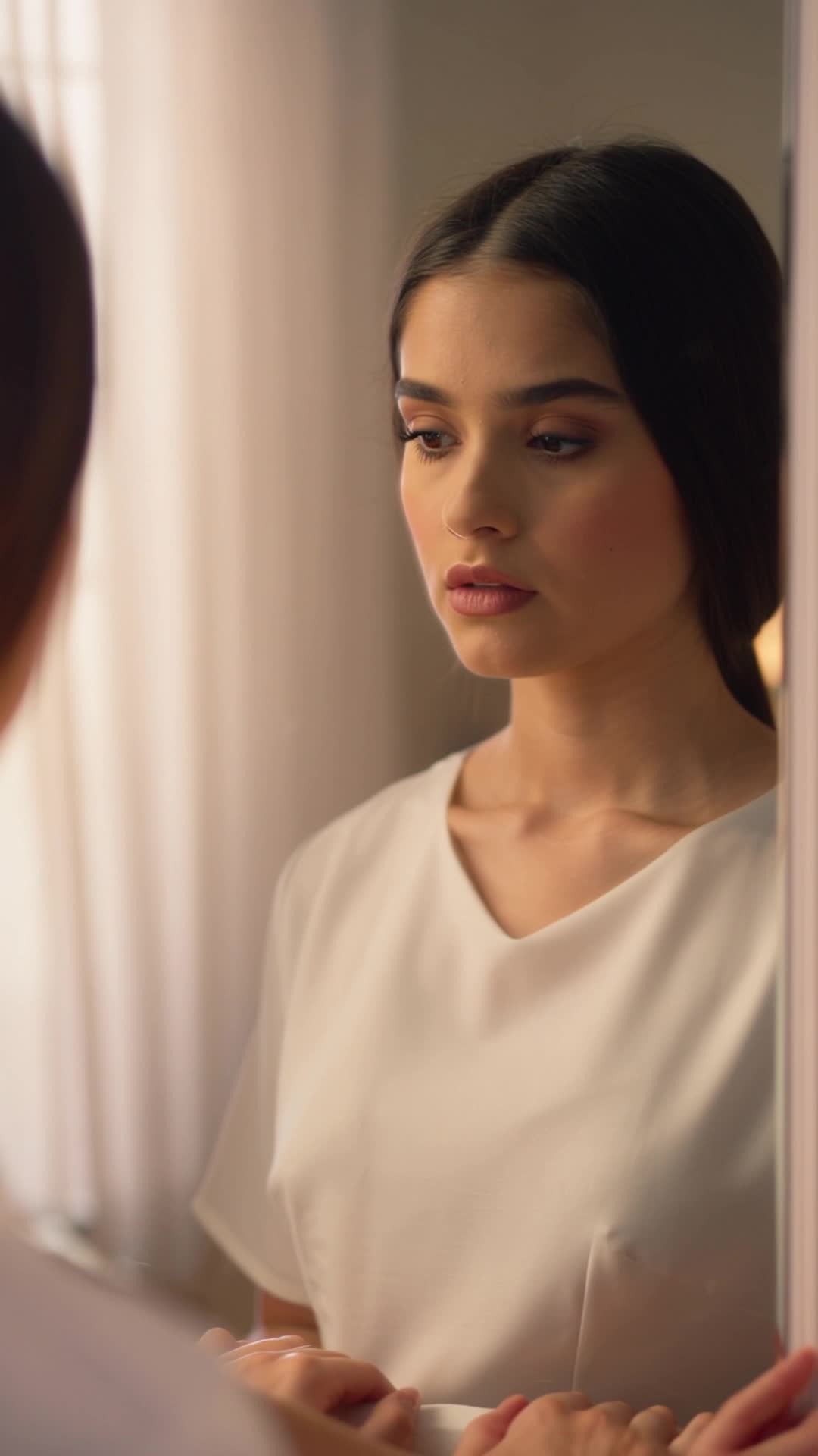 девушка рукой надевает очки на голову как будто это ободок для головы. девушка уверенно смотрит в камеру. рот девушки не подвижен