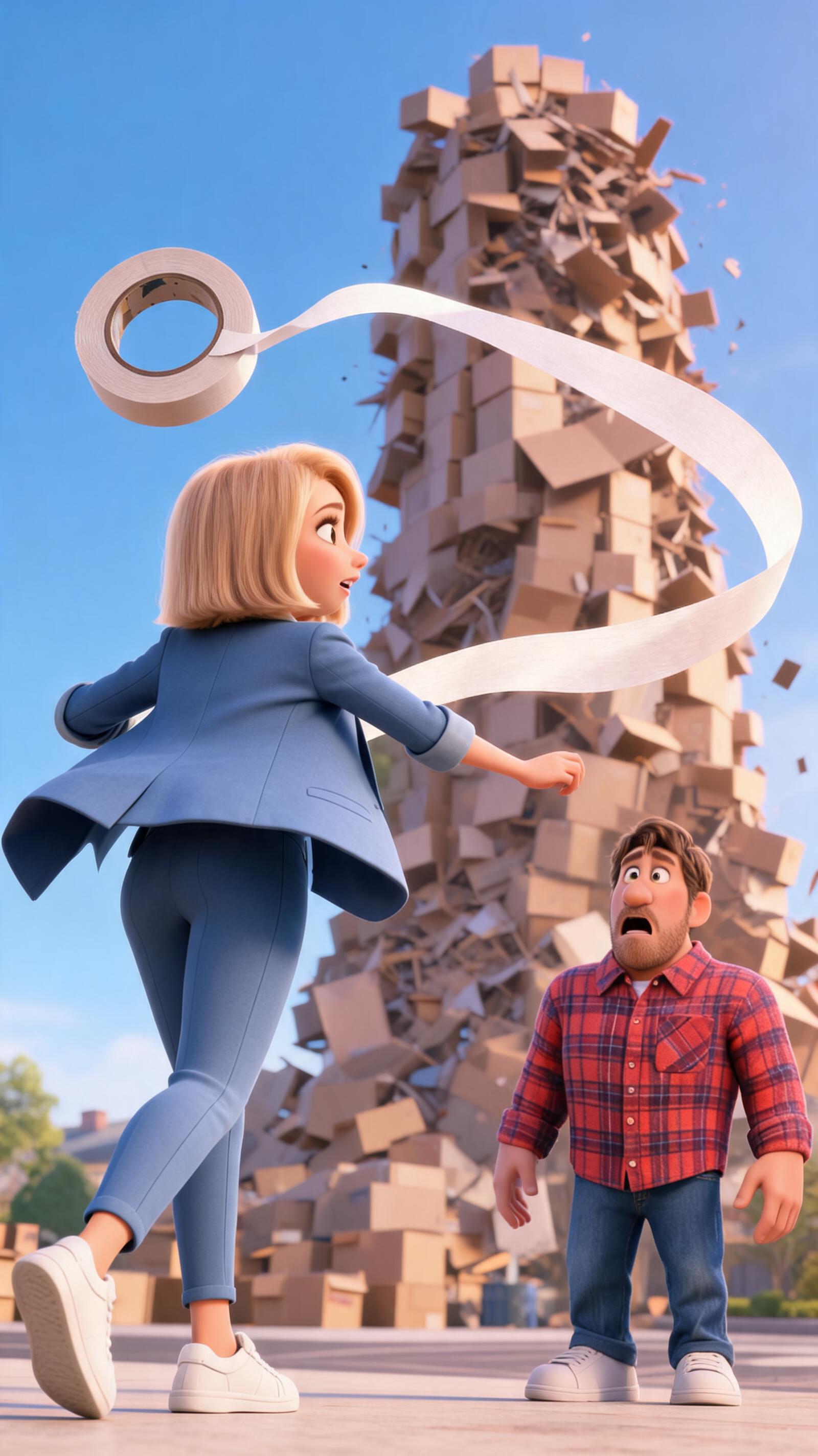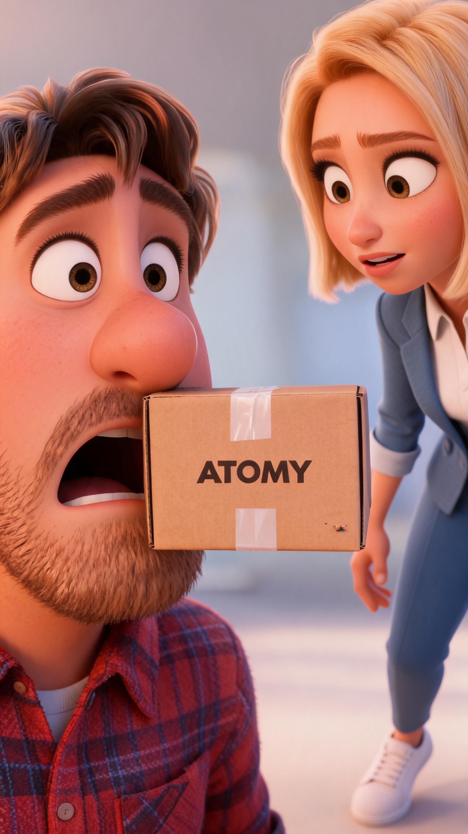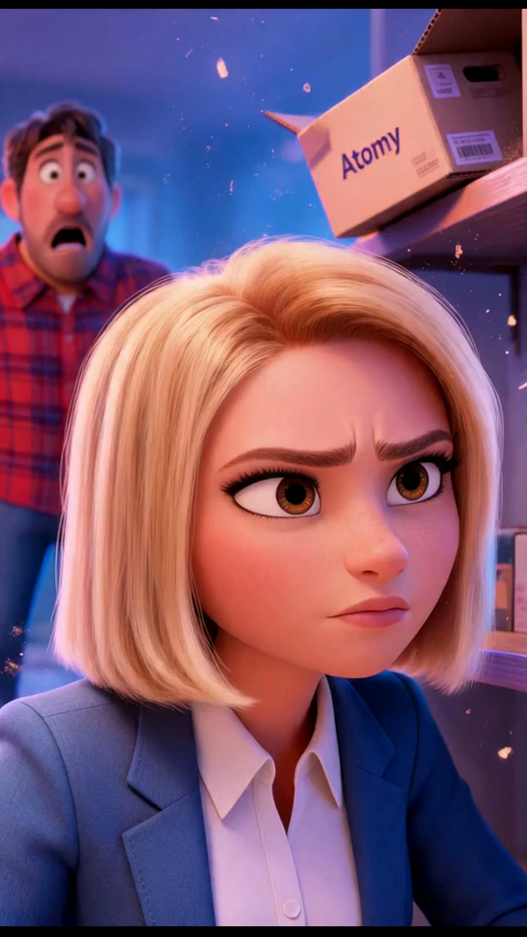 Плавный зум внутрь трапеции, чтобы зритель мог рассмотреть продукты. Мягкий свет исходит от них, подчеркивая качество. On-screen dialogue (characters speak with lip-sync): Атом: "И вот что получается! Во-первых, в основе нашей 'трапеции' лежат реальные, качественные продукты, которые люди покупают для себя." No background music.