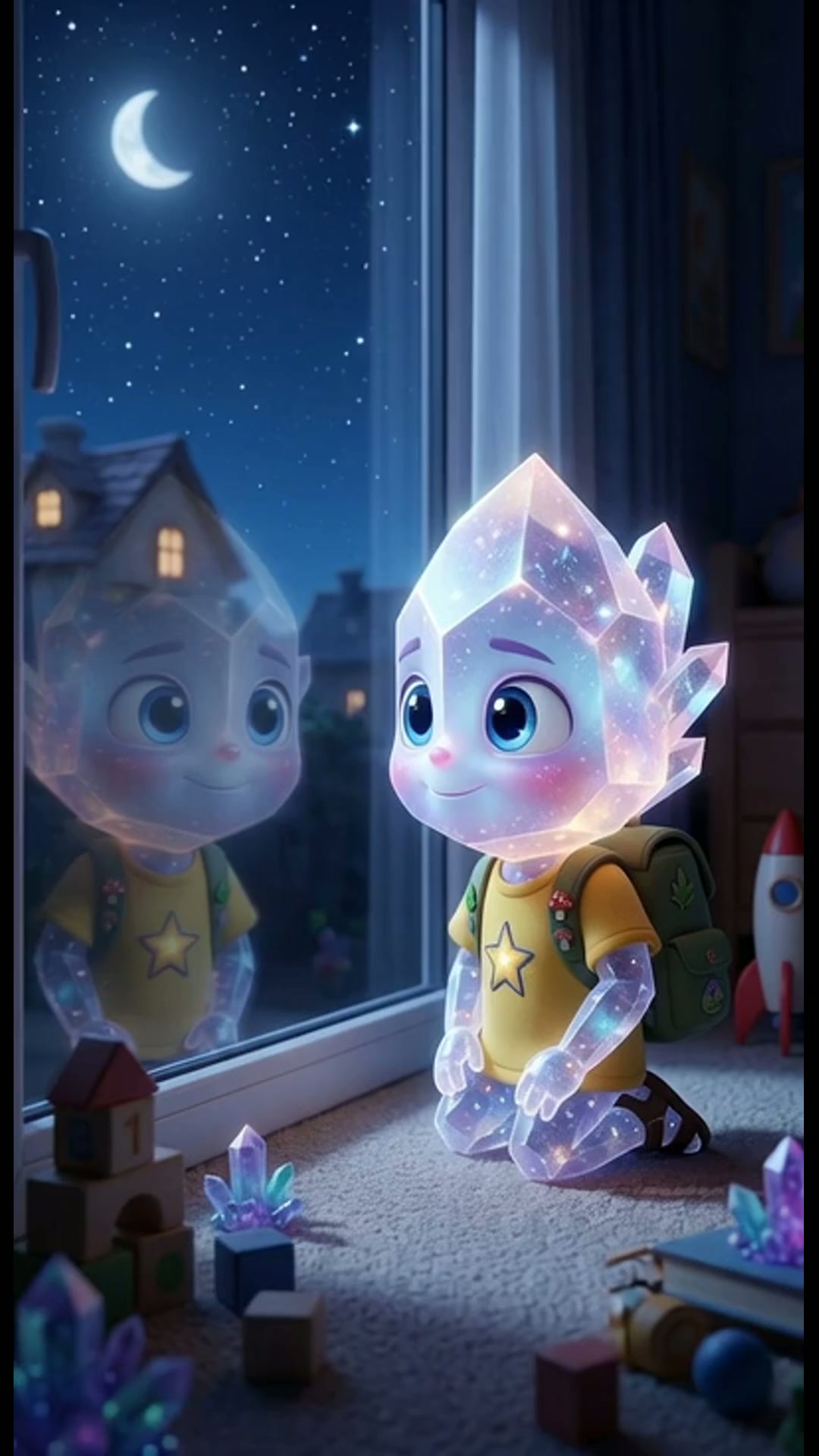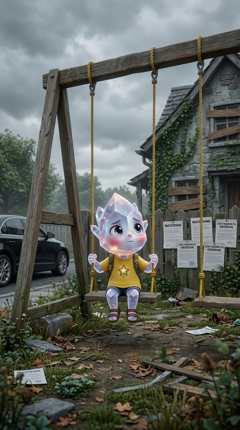 Медленный наезд на лицо Кварцика. Его слезы высохли, и теперь во взгляде читается не страх, а твердое обещание. Он крепко сжимает цепь качелей. On-screen dialogue (characters speak with lip-sync): Кварцик: "Я вернусь... Я всё верну." No background music.