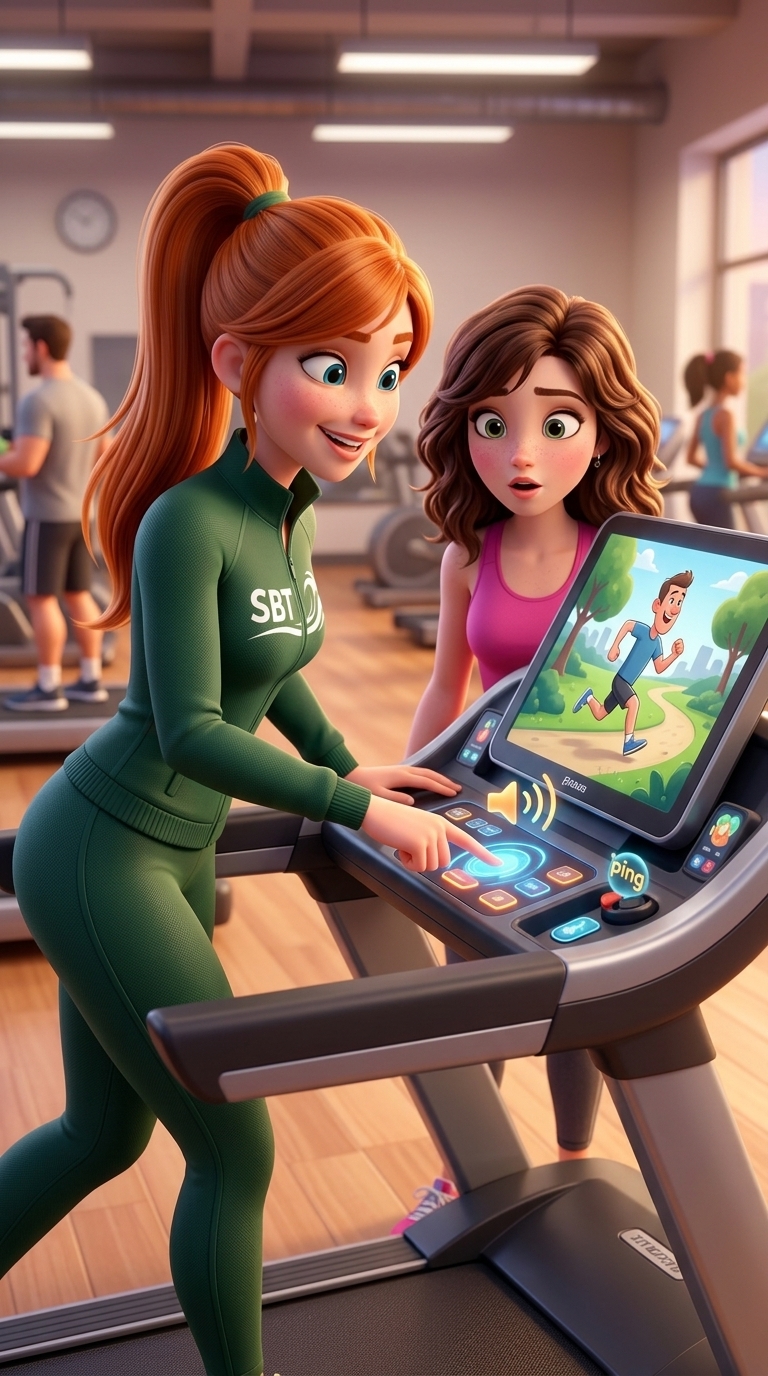 Камера находится на низком уровне и медленно поднимается вверх вместе с движением таза Нади, акцентируя внимание на пиковом сокращении мышц. On-screen dialogue (characters speak with lip-sync): Надя: "Переходим на коврик для ягодичного мостика. Поднимайте таз как можно выше!" No background music.