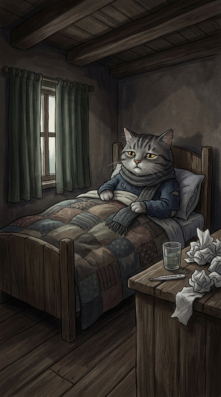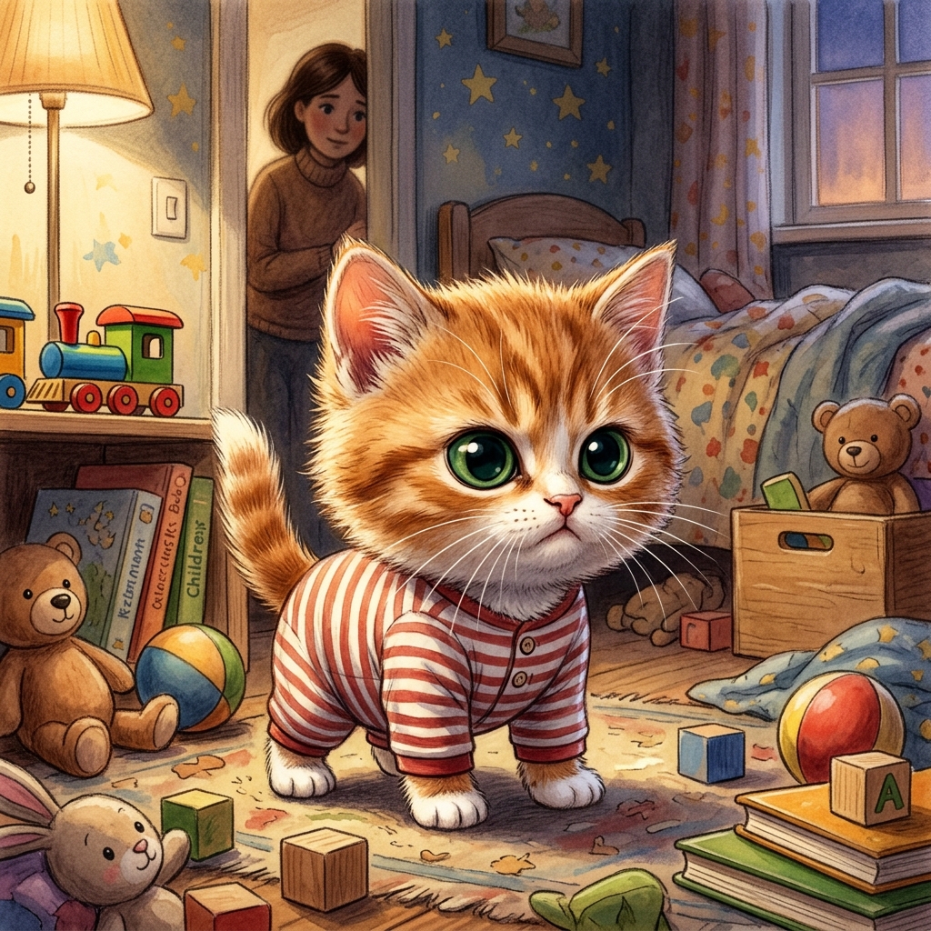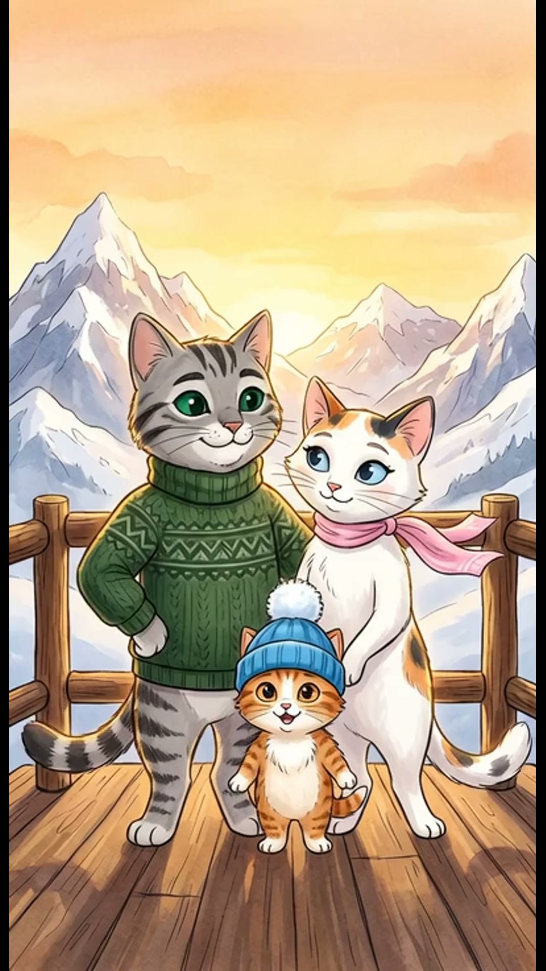 Маленький котенок радостно мяукает и энергично машет обеими лапками, поздравляя именинницу. Он делает забавный прыжок на месте, после чего замирает в милой позе, наклонив голову набок. Камера плавно отъезжает назад, постепенно показывая стоящих рядом и улыбающихся кошку ма и кота папу. В финале кадра интенсивность снегопада немного усиливается, создавая праздничный эффект завершенности и волшеб...