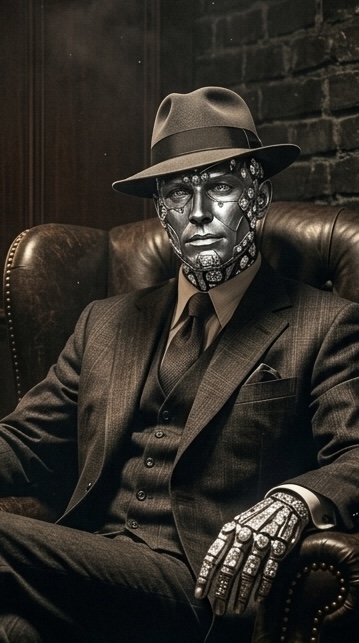 Барон берет в руку телефон и смотрит в него. Крупный план его лица On-screen dialogue (characters speak with lip-sync): БАРОН: "Капелька яда. Всегда знал, что ее блеск подделка." No background music.