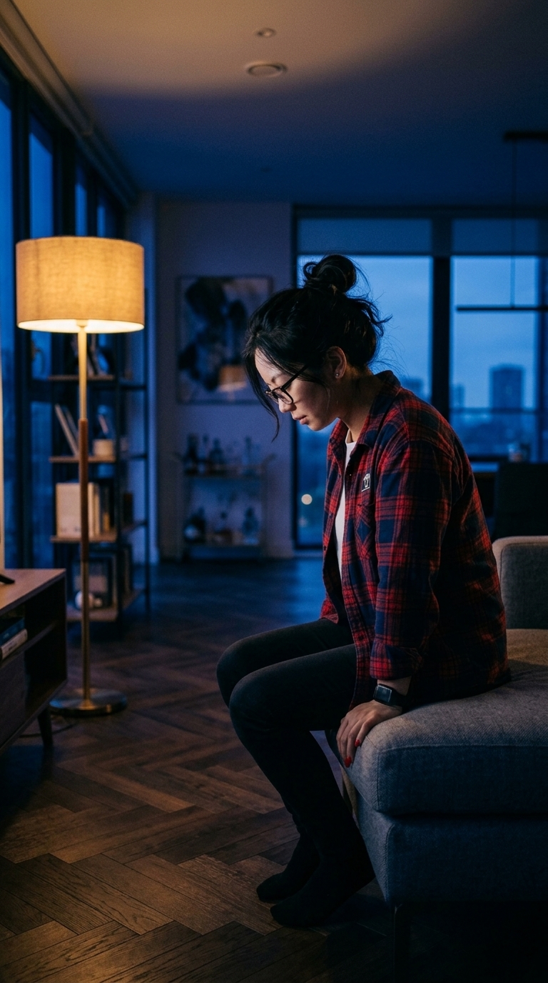 Настя нежно сжимает ладони Олега, её голова склонена. Олег медленно поднимает руку и проводит пальцами по её волосам, его плечи расслабляются. Камера медленно кружит вокруг них, подчеркивая их единение и изоляцию от внешнего мира. Движение плавное, передающее переход от напряжения к облегчению. On-screen dialogue (characters speak with lip-sync): Настя (voice: Нежный, слегка приглушенный сопра...