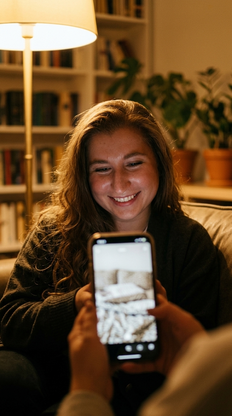 Резкий переход от задумчивого взгляда к озарению. Камера делает быстрый, едва заметный зум на ее глаза в момент, когда приходит идея. Легкая смена фокуса с телефона на ее лицо. Off-screen voiceover (all characters have their mouths closed, no one is speaking on screen): Narrator: "Идея пришла внезапно. Уютная, нежная, как утренний сон. Она создаст свой бренд постельного белья и пижам." No bac...