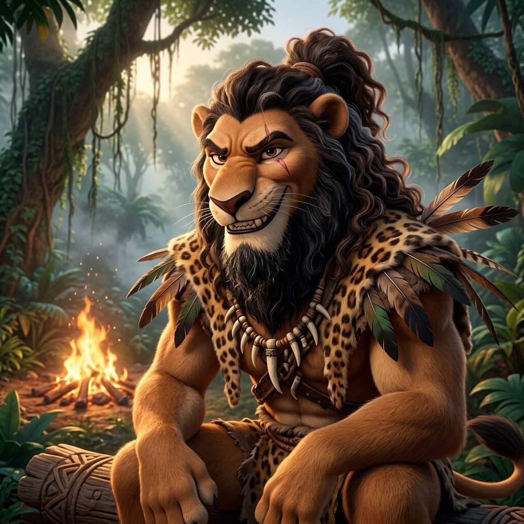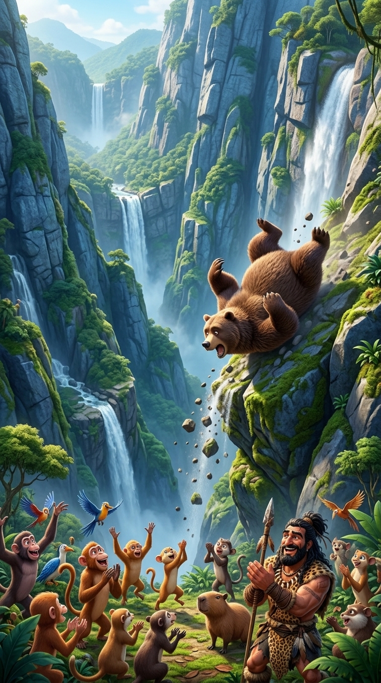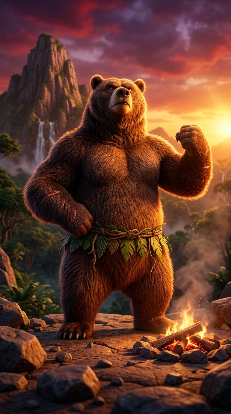 Толпа животных прыгает, обнимается, хлопает медведя по спине, дочь Карла подбегает с цветами. Искры от костра взлетают, ветер разносит листья. Камера панорамирует слева направо по ликующей толпе, ускоряясь, усиливая взрывную радость и единение. Off-screen voiceover (all characters have their mouths closed, no one is speaking on screen): Voice: Глубокий мужской голос с теплой интонацией, спокой...