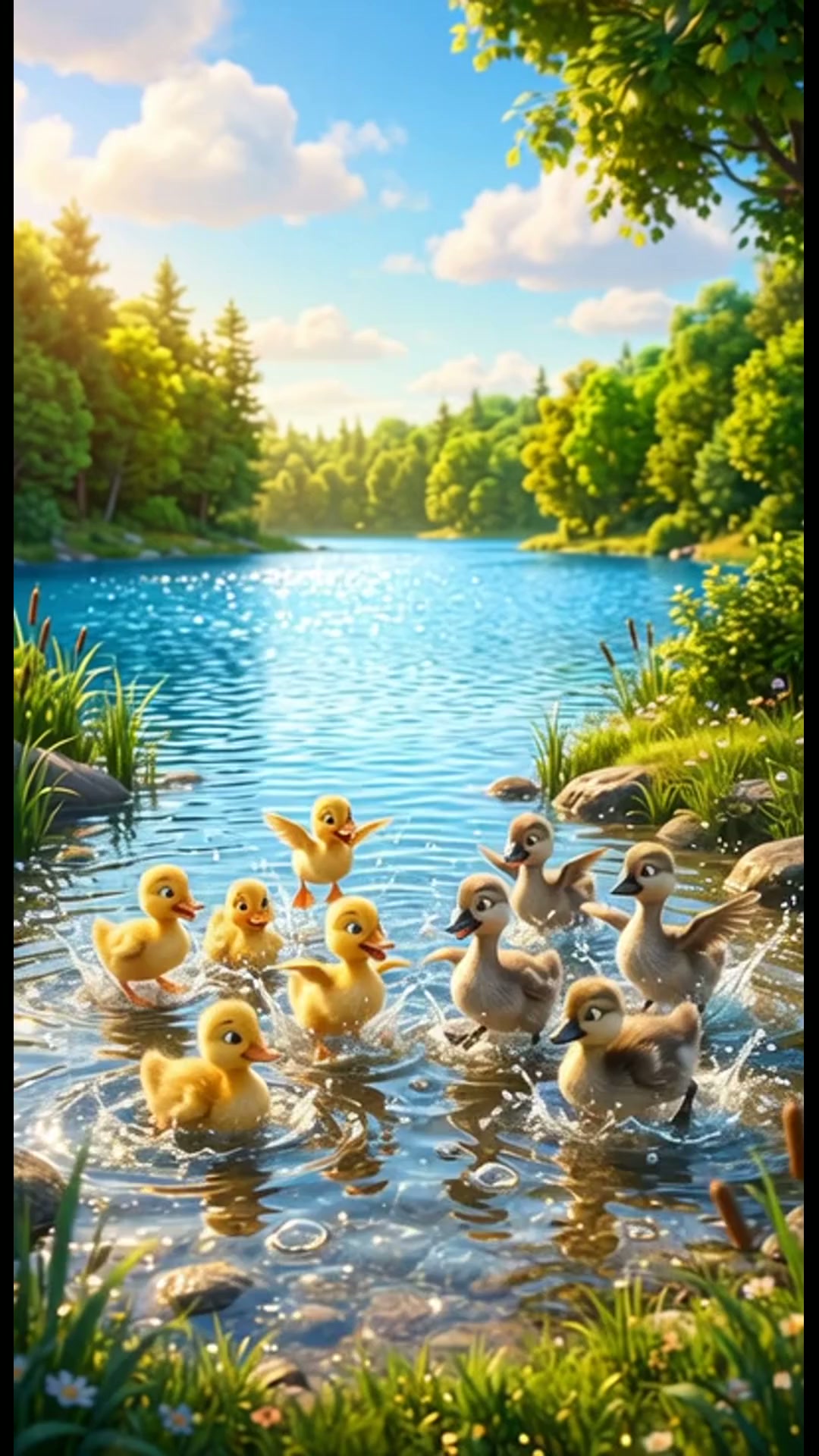 A slow zoom-in on the Bear Cub's face as the birds speak, capturing his change of emotion from hope to hurt. The camera angle makes him look small and vulnerable. On-screen dialogue (characters speak with lip-sync): Утята и гусята: "Вот еще! Нам и без тебя весело. А ты вон, какой большой и неуклюжий, только мешать будешь. Уходи." No background music.