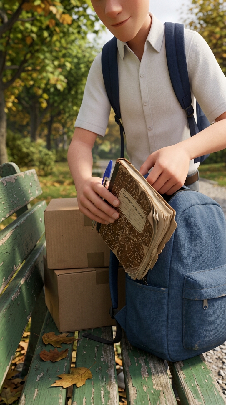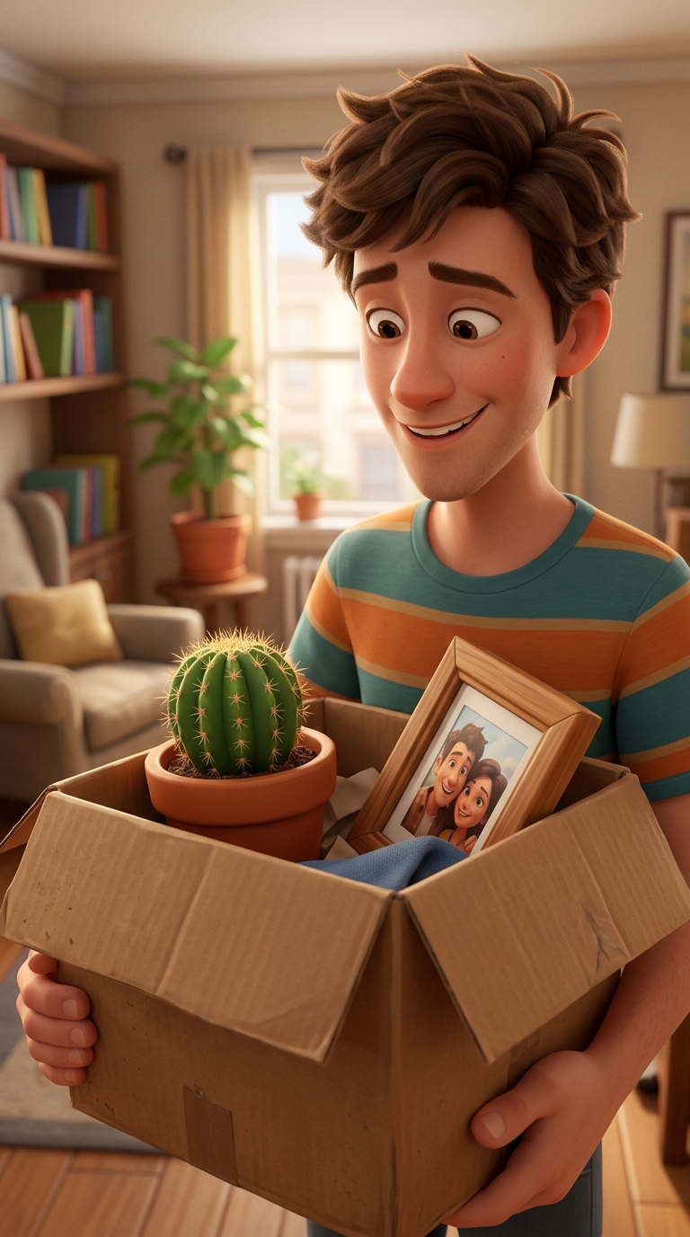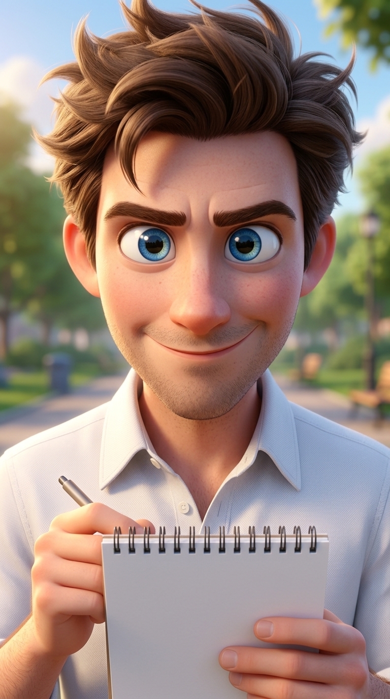 Легкий наезд на лицо. Улыбка медленно появляется на его лице, показывая внутреннюю трансформацию. On-screen dialogue (characters speak with lip-sync): Кевин: "Итак. Пункт первый..." No background music.
