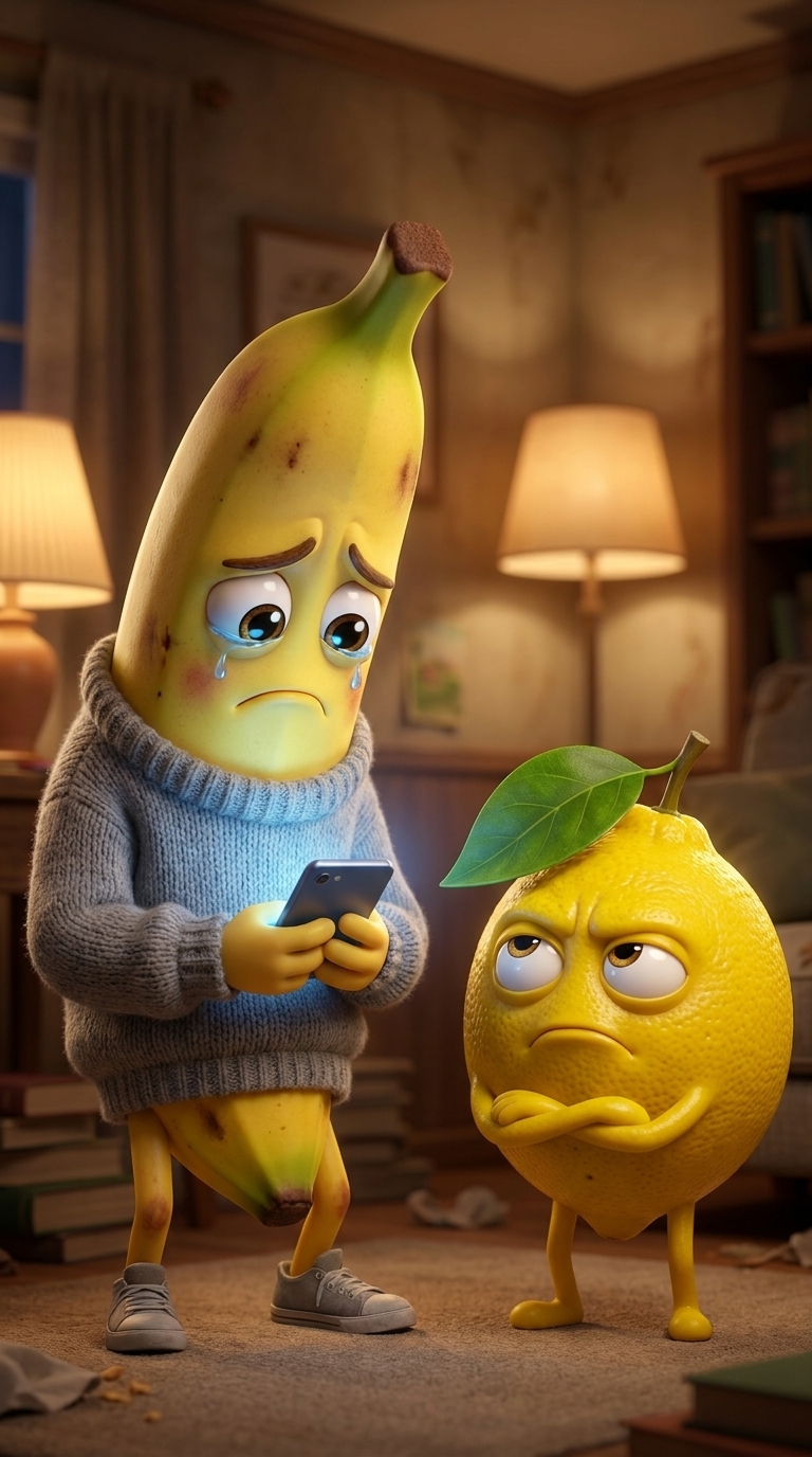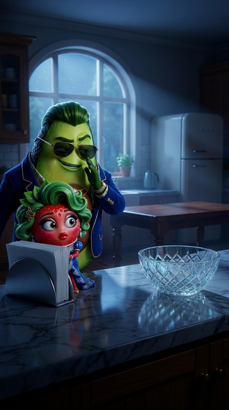 A dramatic crash zoom as Arthur's shell breaks. The camera then quickly pans to Carolina's horrified face, then to the fainting grapes for comedic effect. Off-screen voiceover (all characters have their mouths closed, no one is speaking on screen): Narrator: "Suddenly Arthur’s outer layer cracks open. The room goes silent. Carolina screams. The Grapes faint dramatically." No background music.