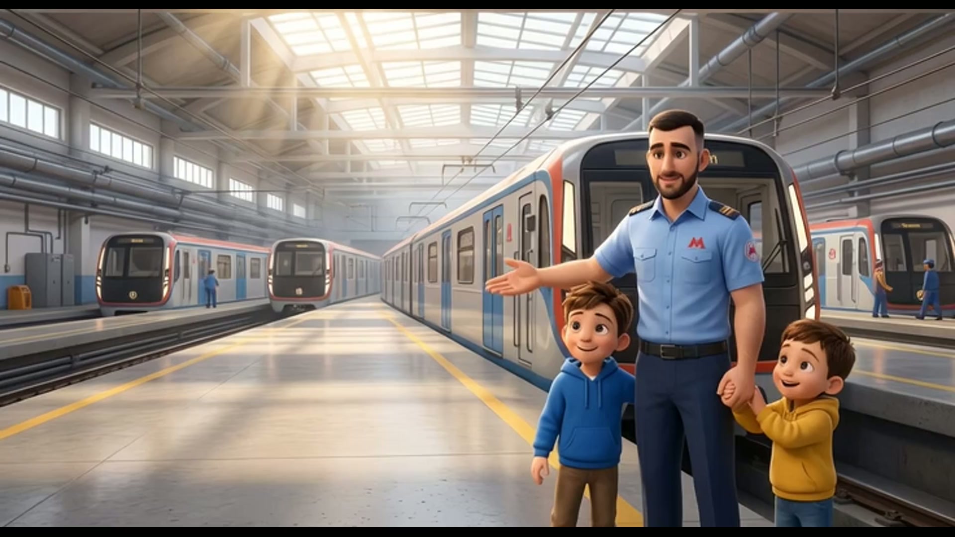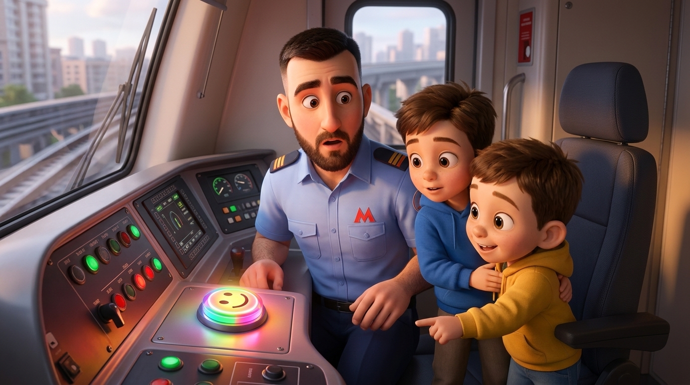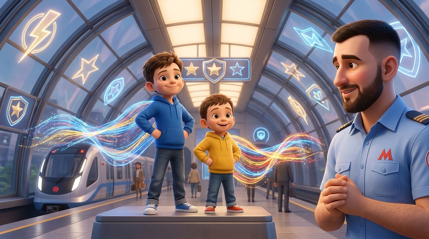 Камера кружится по станции, показывая все волшебные детали. Дети бегают и пытаются поймать пузыри и конфетти. Крупный план их счастливых, смеющихся лиц. On-screen dialogue (characters speak with lip-sync): Артём (voice: Звонкий, высокий детский голос, звучащий искренне, дружелюбно и с легким энтузиазмом.): "Ух ты! Всё такое щекотное! Ха-ха-ха!"; Ярослав (voice: Звонкий, высокий детский голос, ...