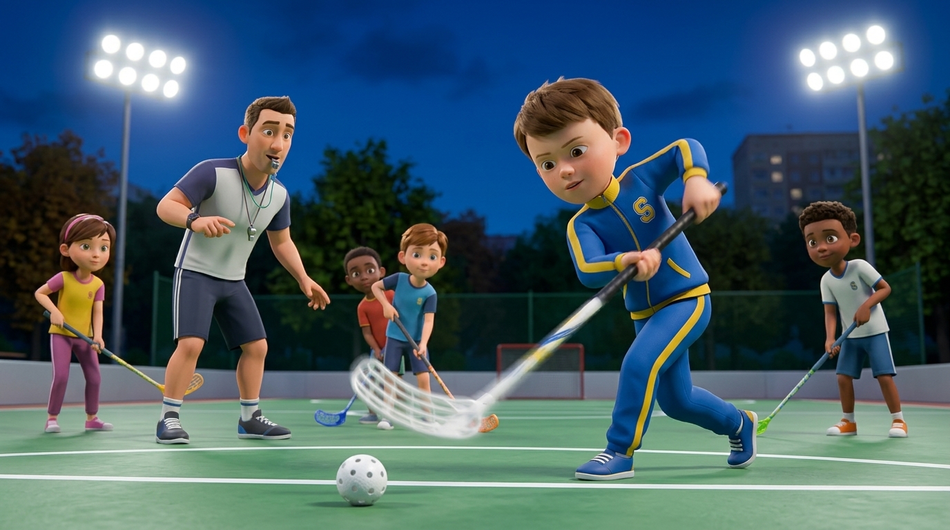 Быстрое панорамирование за движением клюшки, замедленная съемка (slow-motion) в момент удара по мячу. On-screen dialogue (characters speak with lip-sync): Рассказчик: "А каждый вечер — флорбол. Клюшка, мячик и бесконечные броски по воротам." Include background music.