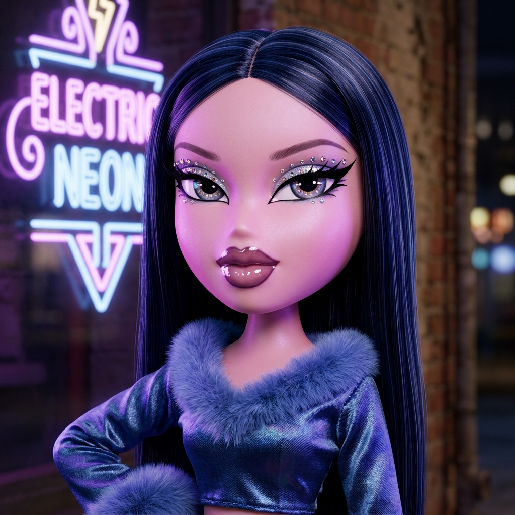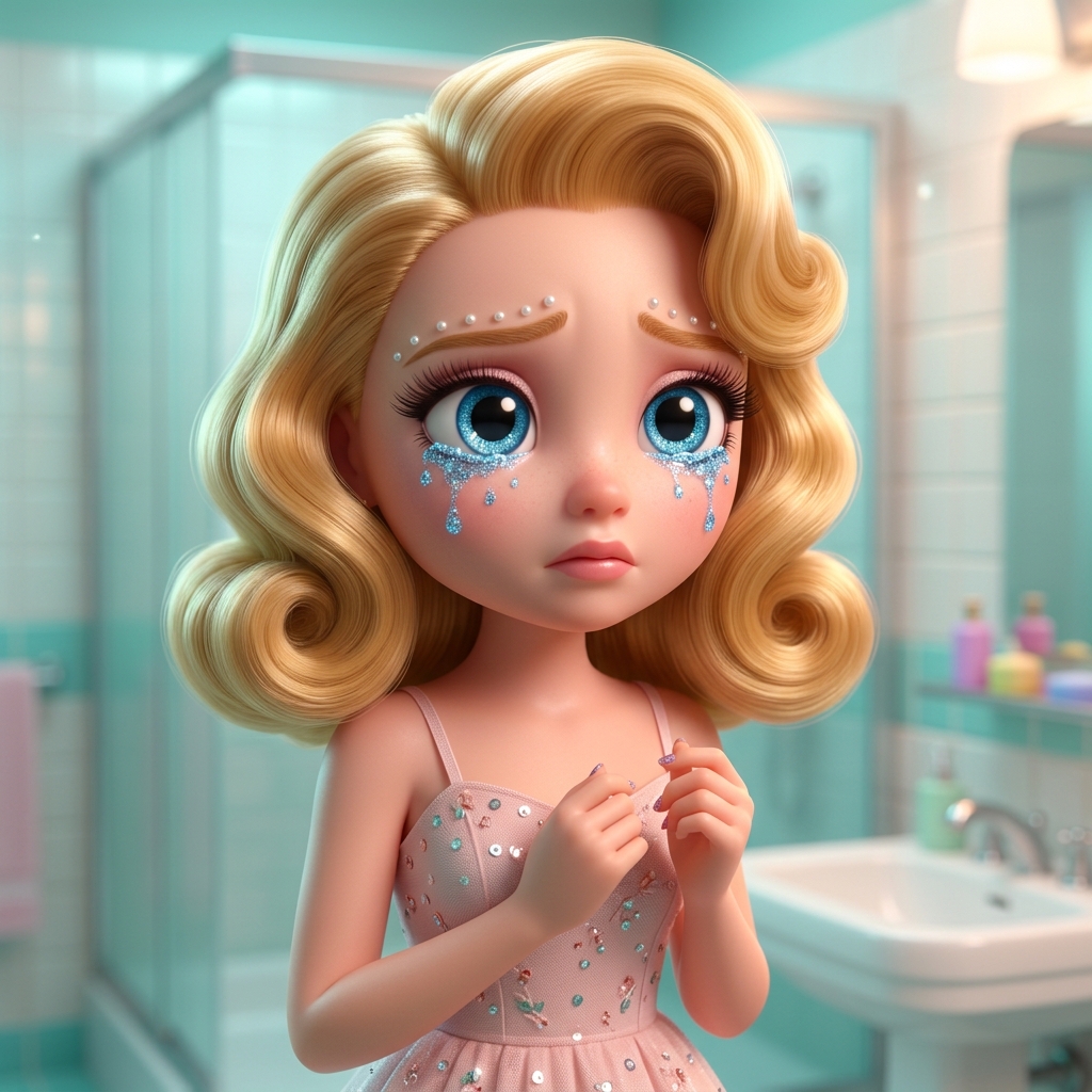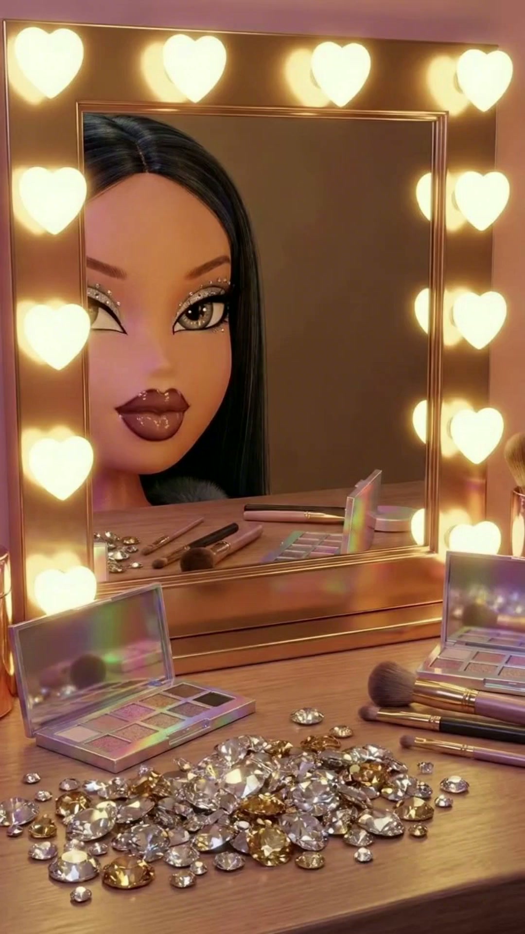 Джейд уверенно наносит блестящие тени на веко, глядя прямо в камеру через зеркало. Ее движения точные и грациозные. Камера плавно приближается к ее глазу, фокусируясь на переливах глиттера и длинных ресницах. Вокруг нее витает облако парфюма, видимое как легкое мерцающее марево в свете ламп. On-screen dialogue (characters speak with lip-sync): Джейд (voice: Низкий, уверенный женский голос с ме...