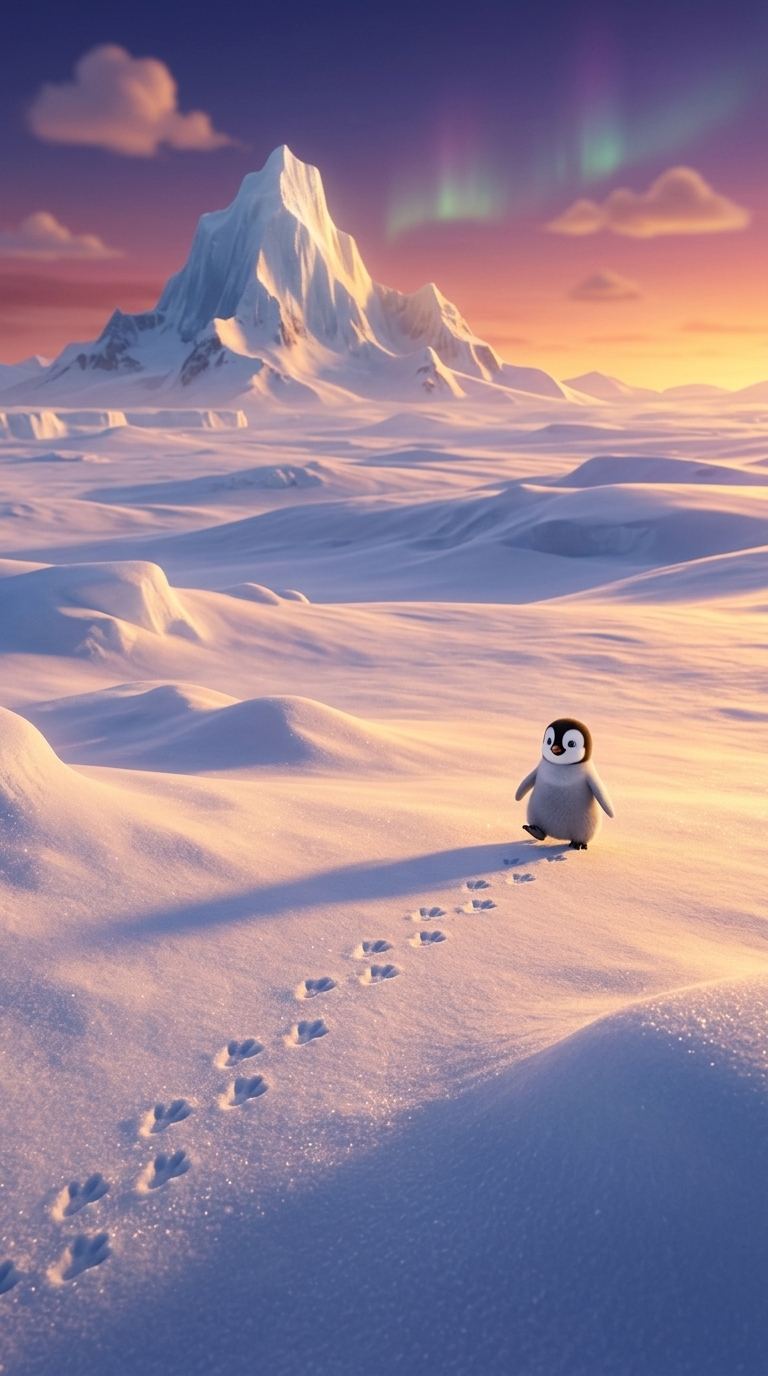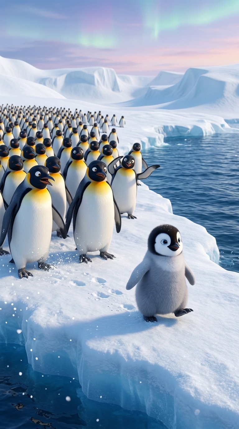 Wide panning shot across the noisy flock of penguins, chaotic movement, penguins waddling quickly towards the water On-screen dialogue (characters speak with lip-sync): Взрослые пингвины: "Скорее в воду! Ныряем! Первым чур я!" No background music.