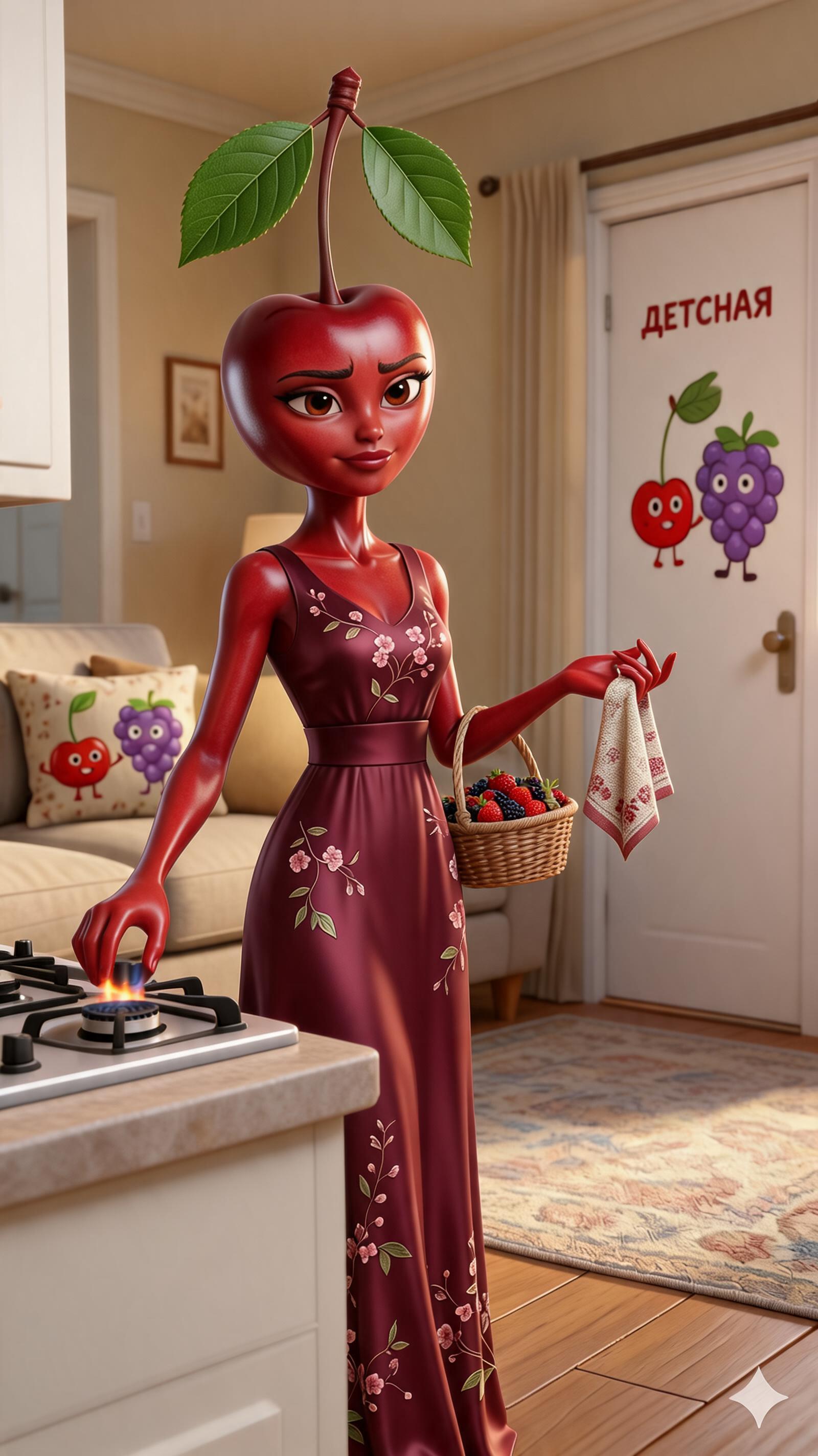Камера медленно наезжает на лицо Огурчика, когда он произносит свою реплику. Резкая смена кадра на шокированное лицо Мамы Вишни. On-screen dialogue (characters speak with lip-sync): Огурчик (voice: Уверенный, слегка хриплый баритон с ироничным подтекстом, спокойной энергией и свежим, бодрым звучанием.): "Не надо... У меня просто стояк..."; Мама Вишня (voice: Мягкое, мелодичное сопрано с бархат...