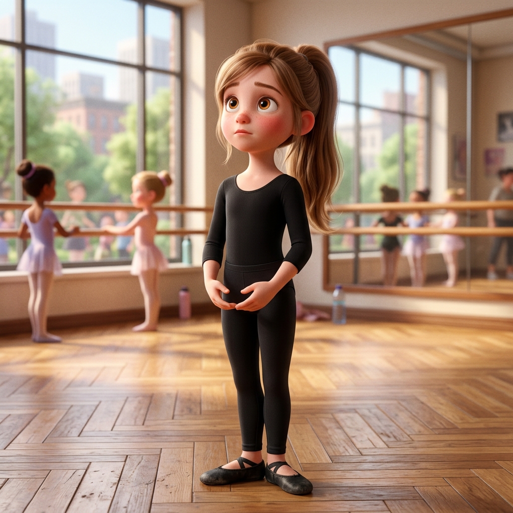 Камера медленно панорамирует от ног Лили в балетках к ее лицу, полному смешанных чувств страха и восторга. Затем мягкий переход на лицо тренера. On-screen dialogue (characters speak with lip-sync): Анна: "Не бойся. Главное в танце - это не шаги, а то, что у тебя в сердце. Покажи мне." No background music.