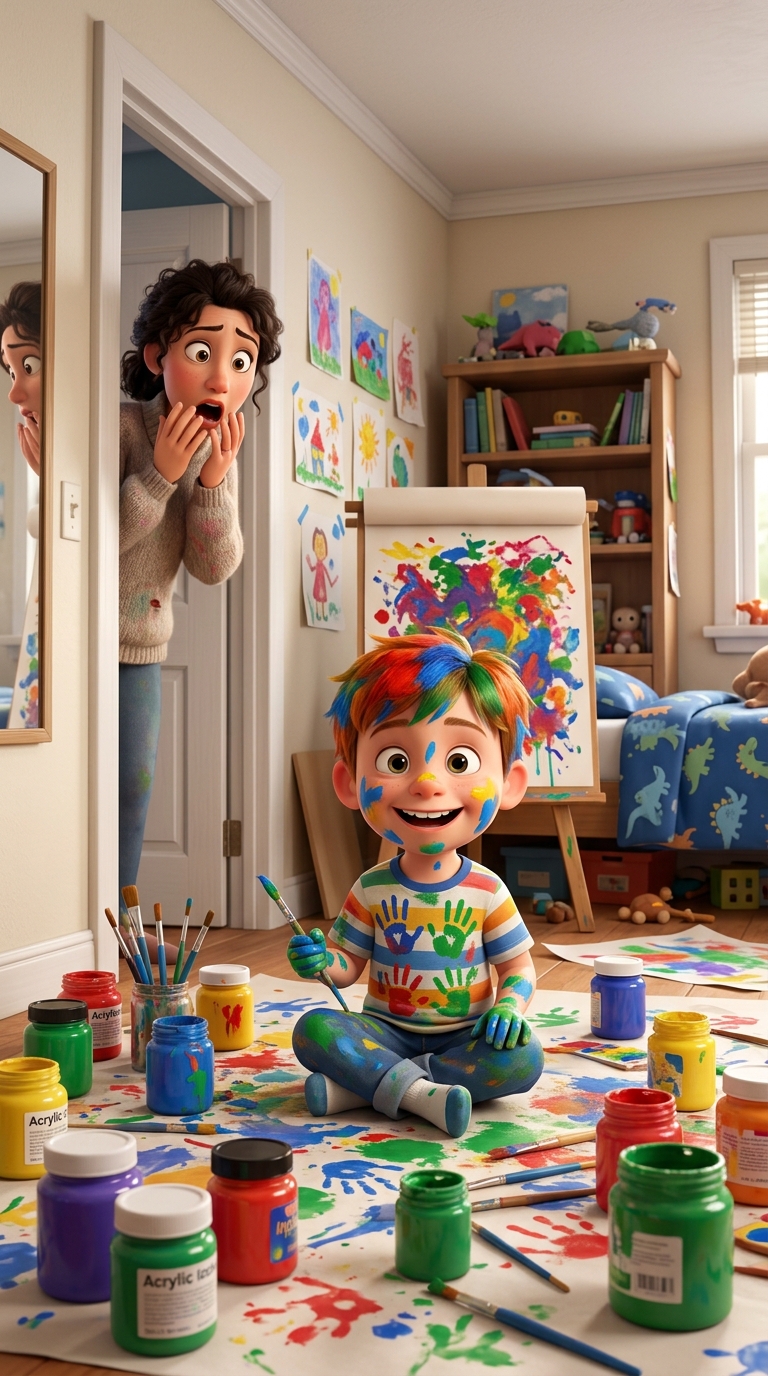 Замедленная съемка (slow-motion) падения мишки с полки. Камера следует за его полетом вниз, показывая его беззащитность. Off-screen voiceover (all characters have their mouths closed, no one is speaking on screen): Narrator: "Но однажды, всего одно случайное движение изменило всё." No background music.