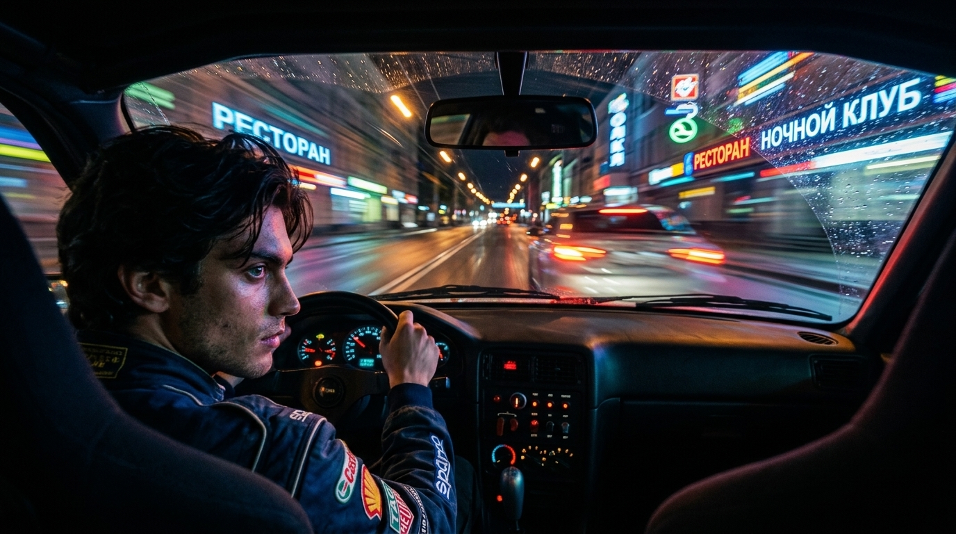 Slow-motion: машина пересекает финишную черту. Затем обычная скорость: Игнат выходит из машины, камера облетает его, показывая ликующую толпу на заднем плане. On-screen dialogue (characters speak with lip-sync): Толпа (крики): "Да! Он сделал это! Победил!" No background music.