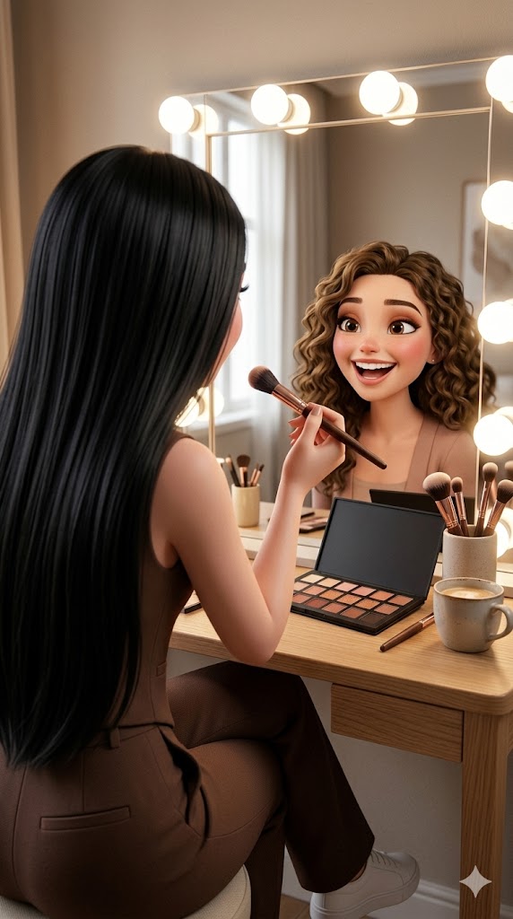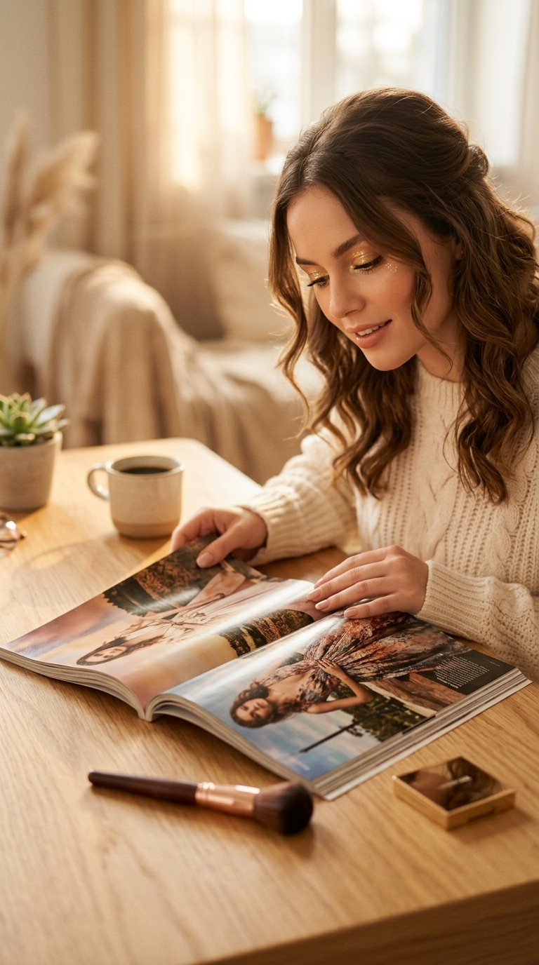 Плавный медленный зум на глаза девушки, отражающие страницы журнала. Камера движется очень медленно, подчеркивая момент зарождения мечты. Off-screen voiceover (all characters have their mouths closed, no one is speaking on screen): Voice: Теплый. Narrator: "Всё началось с мечты. С желания создавать красоту и дарить людям уверенность." Include background music.