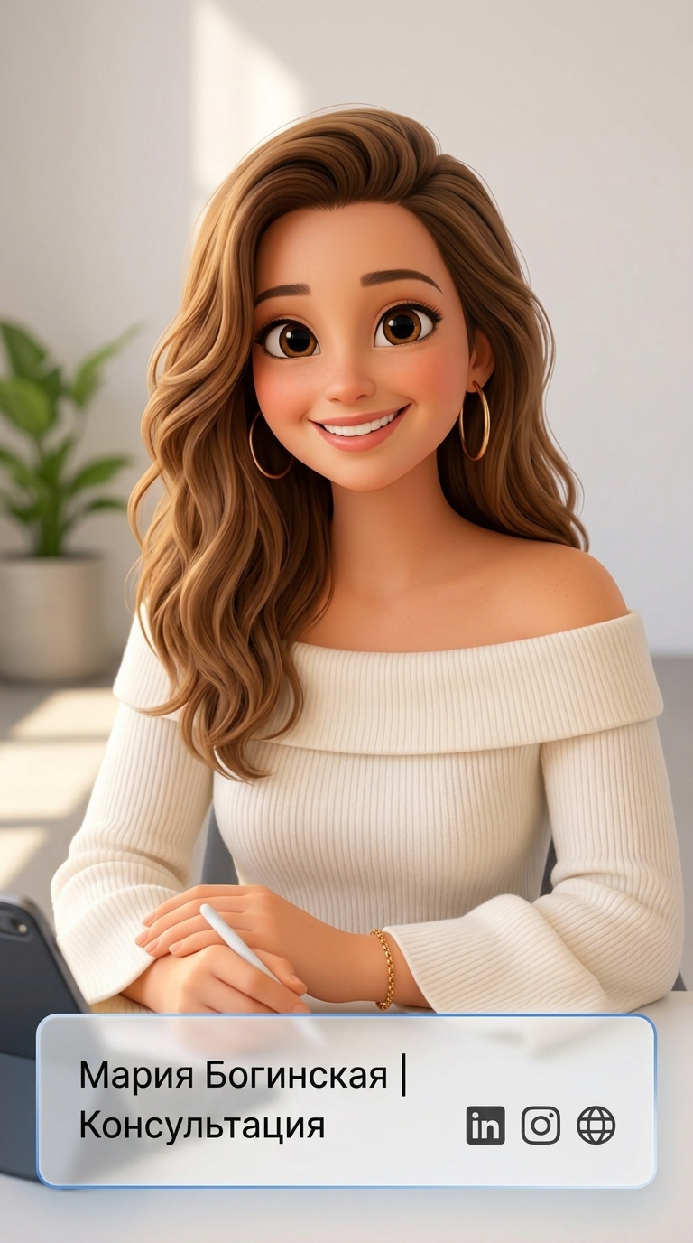 Динамичная смена кадров. Появление текста с услугами сопровождается легкой анимацией и звуковыми эффектами (щелчок). Камера плавно перемещается от одного кадра к другому. On-screen dialogue (characters speak with lip-sync): Мария Богинская (voice: Мягкое, мелодичное сопрано с бархатистой текстурой, спокойным темпом и теплыми, доверительными интонациями.): "Я беру на себя всё сложное: сопровожд...