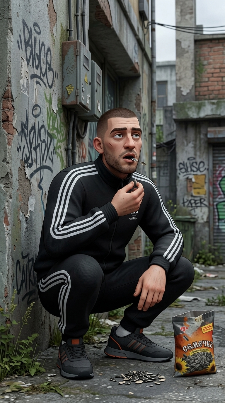 A static shot, barely perceptible movements while chewing, a gloomy atmosphere. The guy in the video is silent and eating sunflower seeds. The girl's voice speaks off-camera. On-screen dialogue (characters speak with lip-sync): Маша: "И от кого? От Вовы, которого я собиралась бросить завтра!" No background music.
