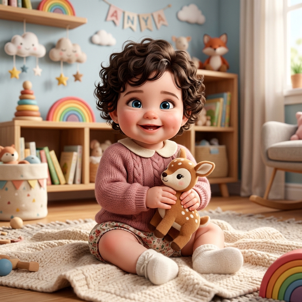 Камера медленно панорамирует по комнате, показывая все убранство. От пола вверх, к шарикам. Останавливается на лице счастливой Валерии. On-screen dialogue (characters speak with lip-sync): Валерия: "(восхищенно) Ого! Кирилл, это... это так красиво!" No background music.